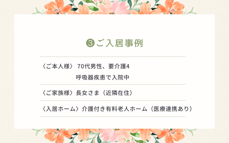 酸素・痰吸引が必要な方の退院支援と、医療と介護が連携した老人ホームへのご入居事例