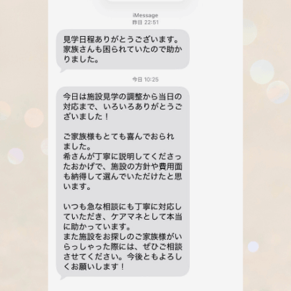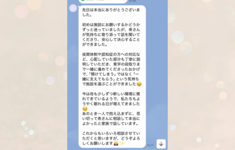 すると希さんは、「そのご予算の中で考えられる選択肢を一緒に整理していきましょう」と言ってくださり、 入居一時金や月額費用の内訳、将来的な負担の変化(介護保険料)まで、一つずつ分かりやすく説明してくださいました。