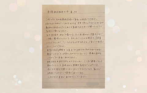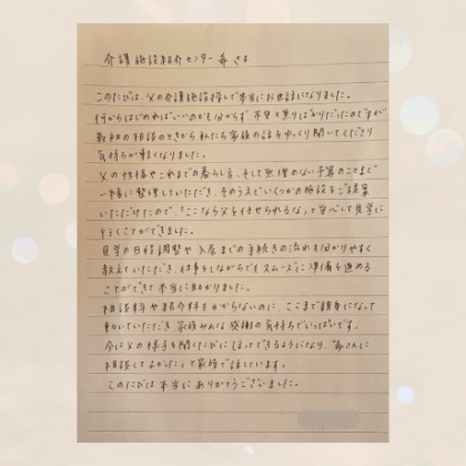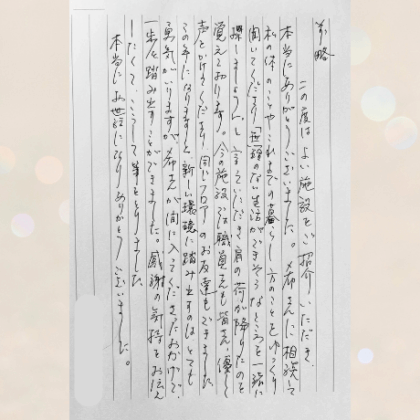 また、入居にあたっての引越し業者や不用品の廃棄業者の手配まで相談に乗っていただきありがとうございました。