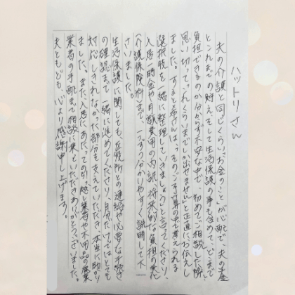 夫の介護と同じくらい、お金のことが心配で、夫の年金とこれまでの貯え、そして生活保護の事も含めて、どこまで負担できるのか分からず不安な中で、初めてご相談した際、思い切って「これくらいまでしか出せません」と正直にお伝えしました。