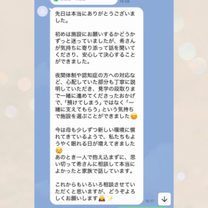 生活保護に関しても、区役所との連絡や必要な手続きの確認まで一緒に進めてくださり、 自分だけではとても対応しきれなかった部分を支えていただき、本当に助かりました。